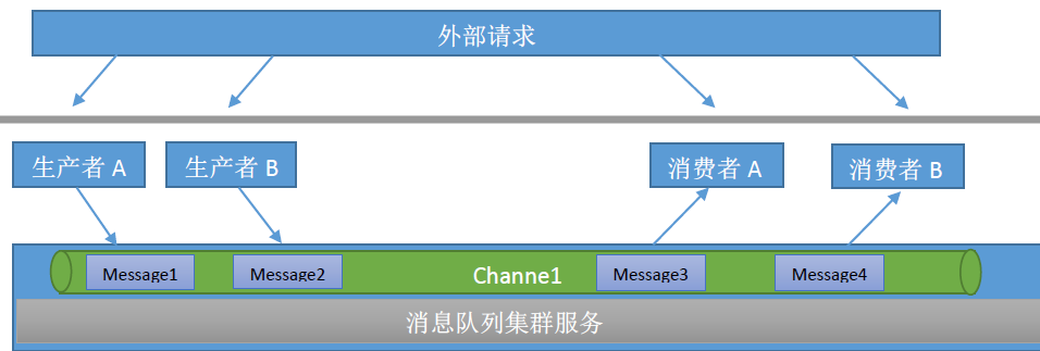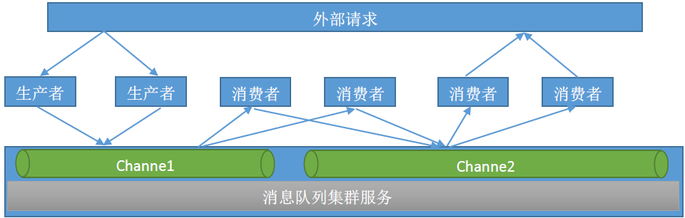 在生产者消费者Producer/Consumer模式下,上层应用接收到的外部请求后开始处理其当前步骤的操作,在执行完成后将已经完成的操作发送至指定的频道channel当中,并由其下层的应用监听该频道并继续下一步的操作,如果其处理完成后没有下一步的操作就直接返回数据给外部请求,如果还有下一步的操作就再将任务发布到另外一个频道,由另外一个消费者继续监听和处理。