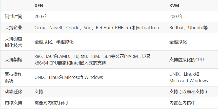 半虚拟化:para virtualization,半虚拟化要求guest OS 的内核是知道自己运行在虚拟化环境当中的,因此guestOS的系统架构必须和宿主机的系统架构相同,并且要求对guest OS的内核做相应的修改,因此半虚拟化只支持开源内核的系统,不支持闭源的系统,比较常见的半虚拟化就是早期版本的XEN,但是Xen 从其3.0 版本开始,可以支持利用硬件虚拟化技术的支持(http://www-archive.xenproject.org/files/xen_3.0_datasheet.pdf),实现了完全虚拟化,可以在其平台上不加修改的直接运行如Linux/Windows 等系列的操作系统,使得系统具备了更好的兼容性。