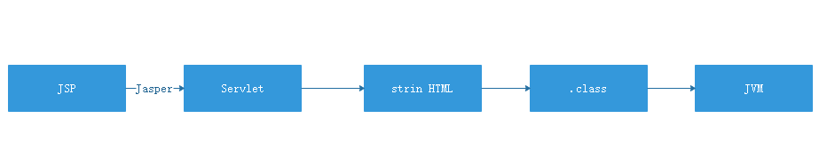 JSP 先转换为 Servlet的源代码.java文件(Tomcat中使用Jasper转换),然后再编译成.class文件,最后就可以在JVM中运行了。