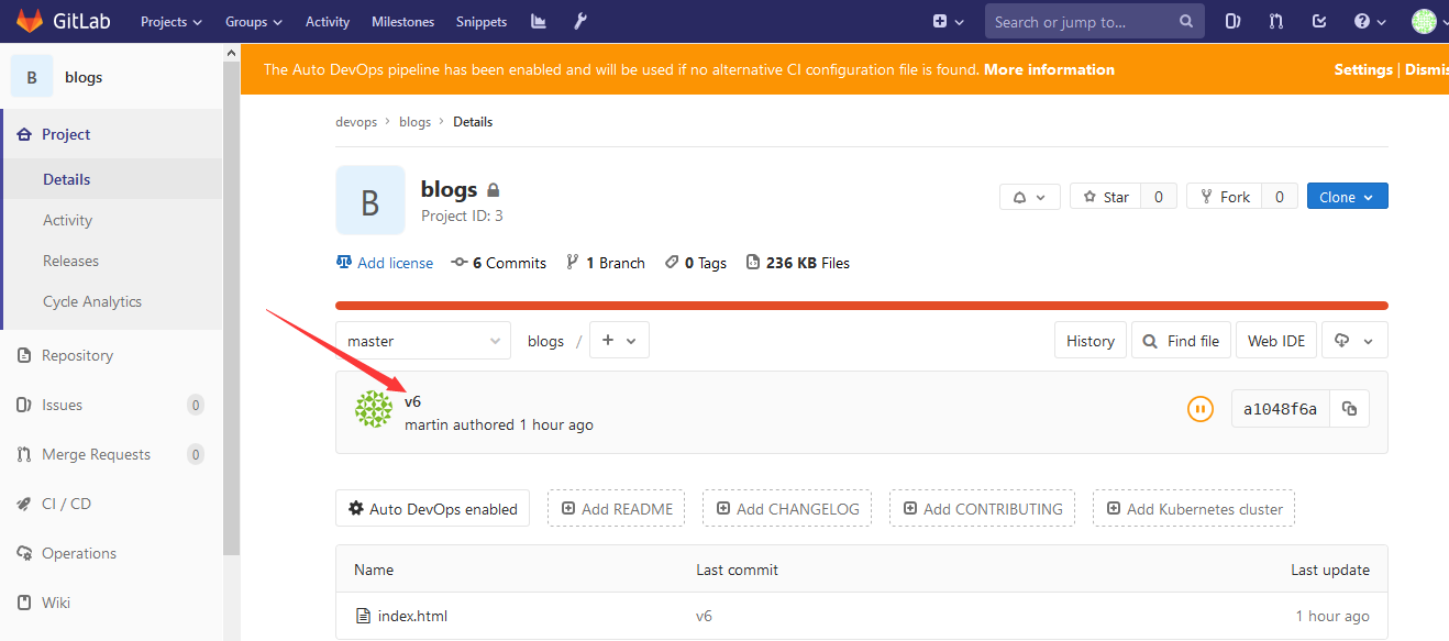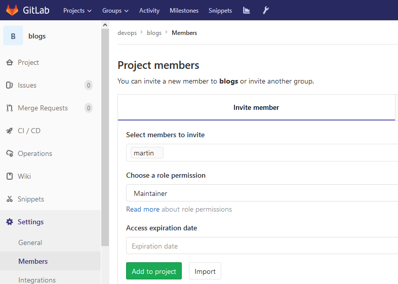 将用户加入这个项目,并授权为Maintainer,即devops组blogs项目的leader,此用户可自行向blogs项目中添加组成员。