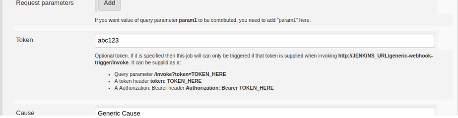 Request parameter: curl -vs http://localhost:8080/jenkins/generic-webhook-trigger/invoke?token=abc123 2>&1